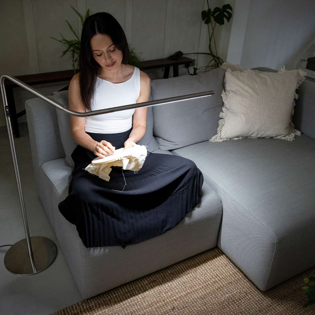 Elegant gulvlampe med dagslys og høj farvegengivelse – ideel til broderi og håndarbejde