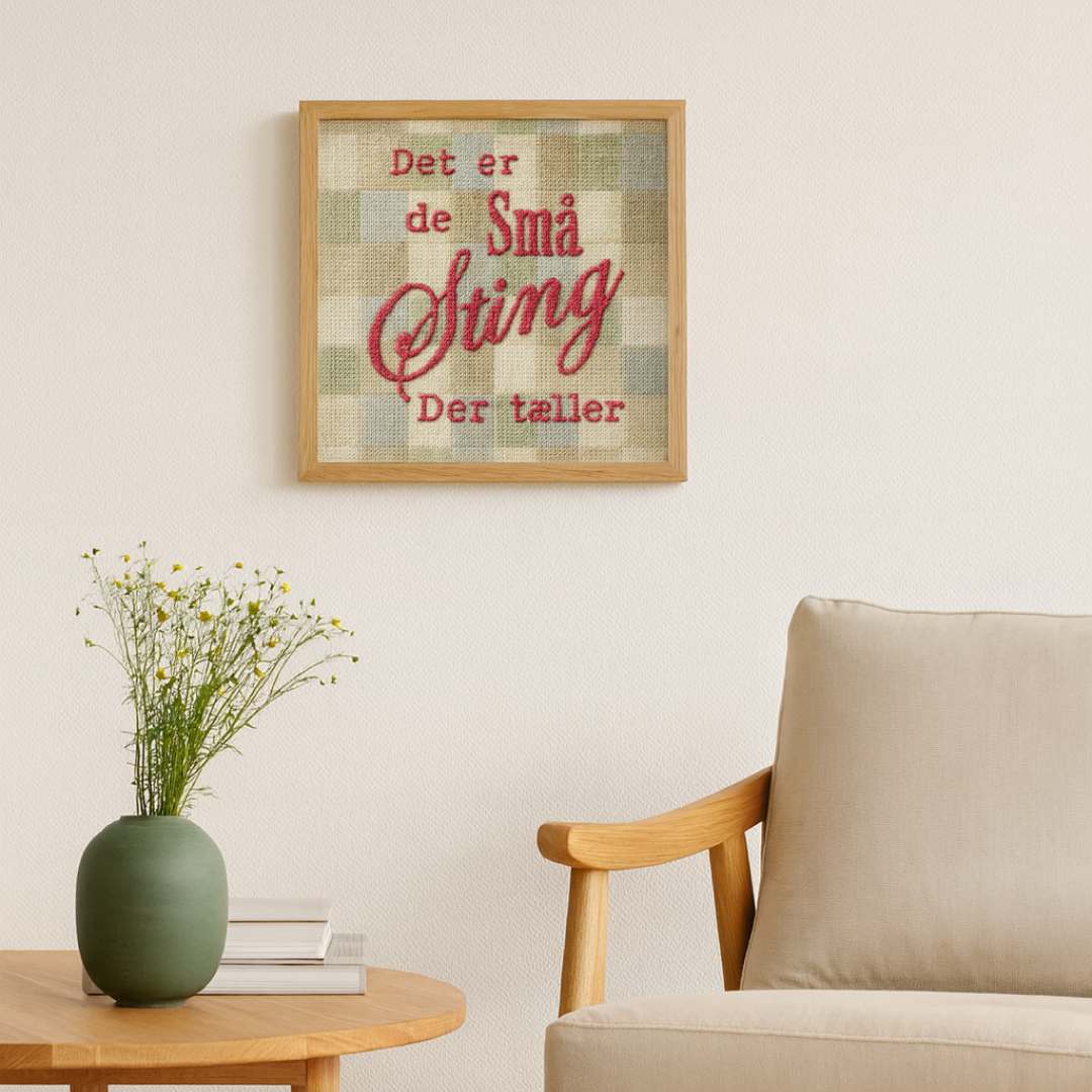 Med Det er de små sting der tæller – broderikit får du et stemningsfuldt projekt, der minder os om, at det netop er de små sting, der gør forskellen. Designet er udformet som et regulært kvadratisk motiv, perfekt til at indramme og hænge på væggen.