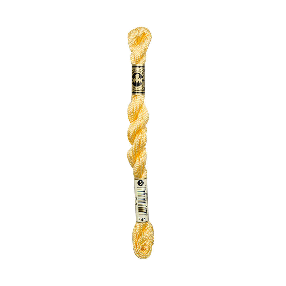 DMC Perlegarn No. 5 – 25 m – fv. 744 Grapefruit er et broderigarn i 100 % bomuld med en fyldig struktur og en klar glans. Tråden er snoet, så den fremstår rund og tydelig i stingene. Du arbejder med hele tråden, hvilket gør det nemt at opnå et ensartet og roligt resultat i dit broderi.