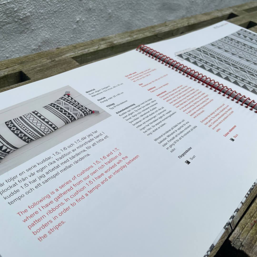 Hvert projekt er nøje beskrevet – både på svensk og på engelsk. Bogen indeholder forslag til valg af materialer, men der er også rig mulighed for at tilpasse både materialer og farver, og derigennem lave egne projekter baseret på bogens mange smukke mønstre. Renée har blandt andet hentet inspiration fra vævede tekstiler fra hele verden og leget med sammensætningen af forskellige grafiske former.
