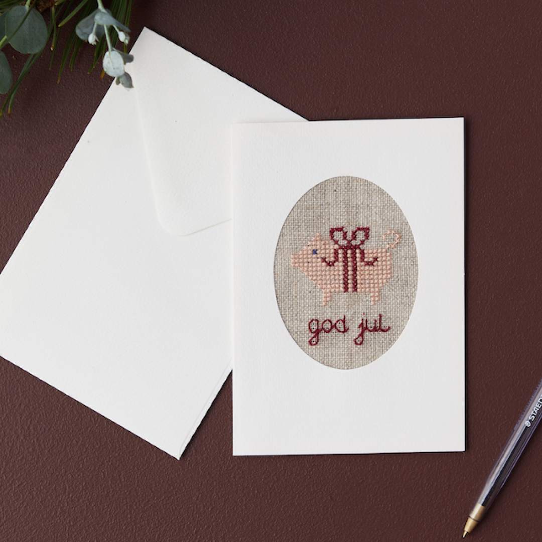Broderikittet indeholder alt, hvad du skal bruge: stof, garn, nål, mønster og kort i karton. Tilføj blot en saks og lidt lim, så er du klar til en hyggelig stund med broderiet og et færdigt kort, der kan gemmes som et minde.
