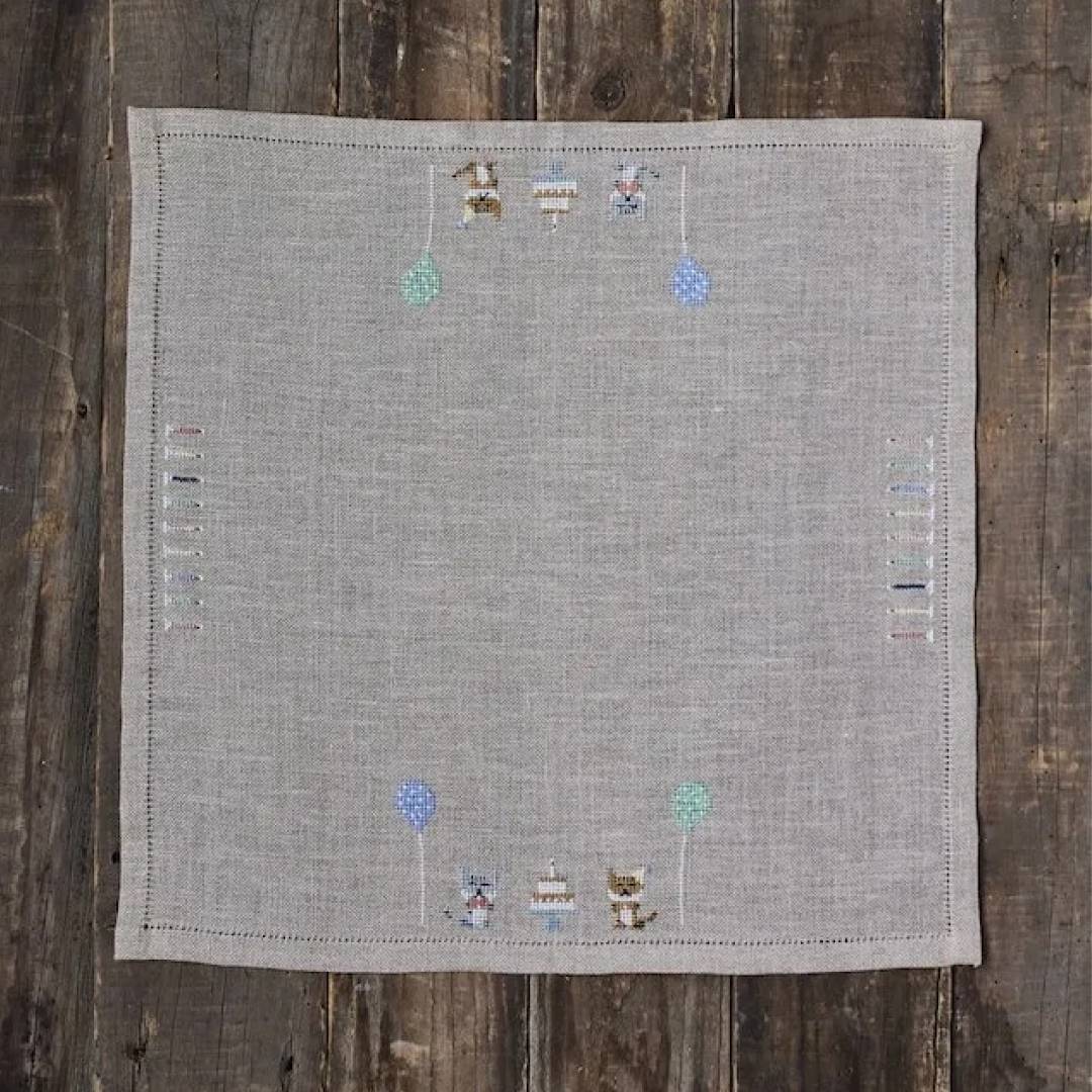 Med dette broderikit kan du skabe en helt særlig tradition: en personlig serviet til børnefødselsdagen, som kan tages frem år efter år. Motivet forestiller to katte med lagkage, balloner og fødselsdagslys – broderet i korssting på hørlærred. Langs kanten er der tænkt plads til at tilføje et nyt lys for hvert år barnet fylder, så servietten vokser med traditionen og bliver et unikt minde.