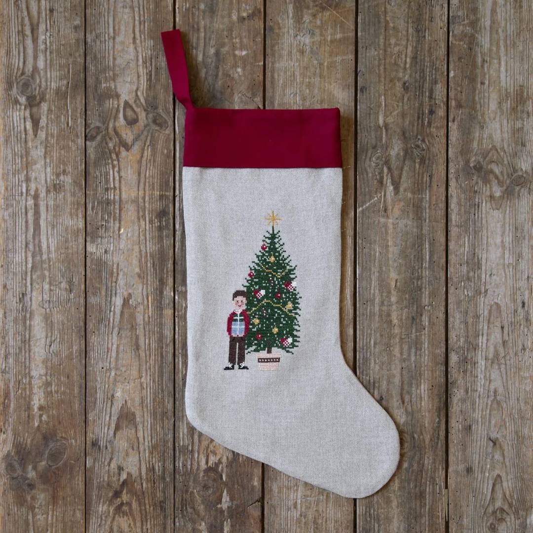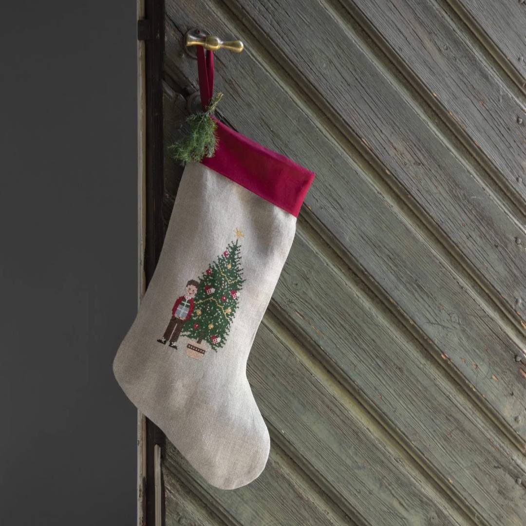 Sokken er inspireret af eventyret om Nøddeknækkeren, hvor Gustav er en af børnene. Motivet broderes i korssting på hørstof og kombineres med mørkerødt inderstof og en praktisk strop, så den kan hænges frem på væggen, over pejsen eller på børneværelset. Resultatet er en julesok, der både pynter smukt og kan fyldes med gaver, slik og små overraskelser i december.
