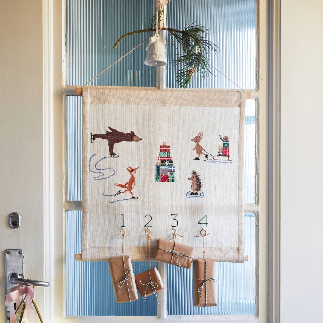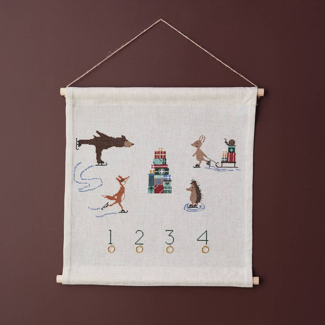 Brodér din egen adventskalender og skab en hyggelig tradition, der kan tages frem år efter år. Jul på Skøjtebanen er et stemningsfuldt motiv, hvor dyrene samles juleaften på den isede sø. Fru Hare, hr. Pindsvin, hr. Bjørn, hr. Ræv og fru Snegl mødes på skøjtebanen – nogle mere øvede end andre – men alle med julestemningen i hjertet.