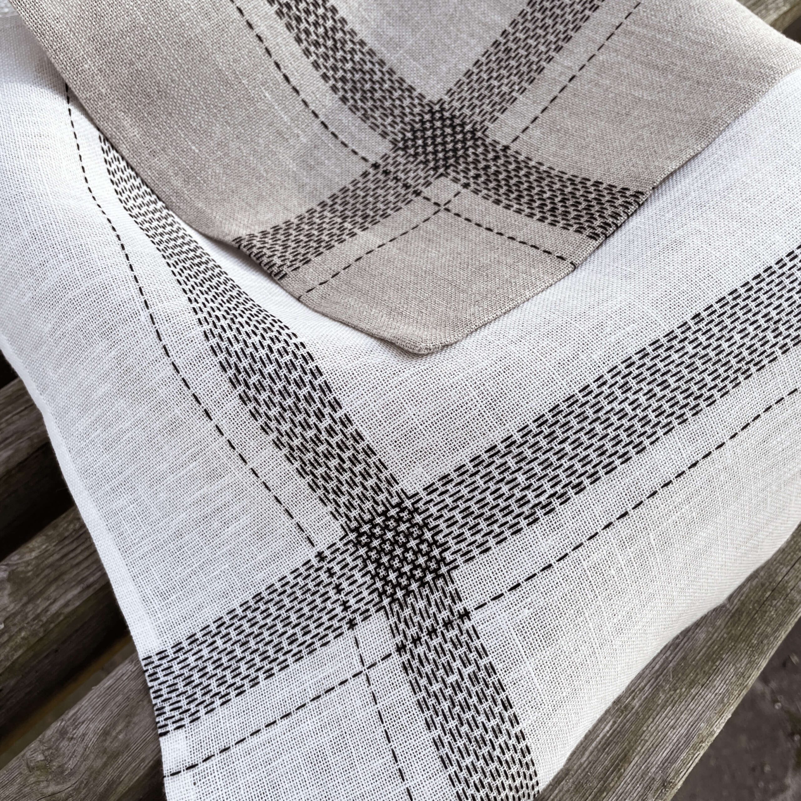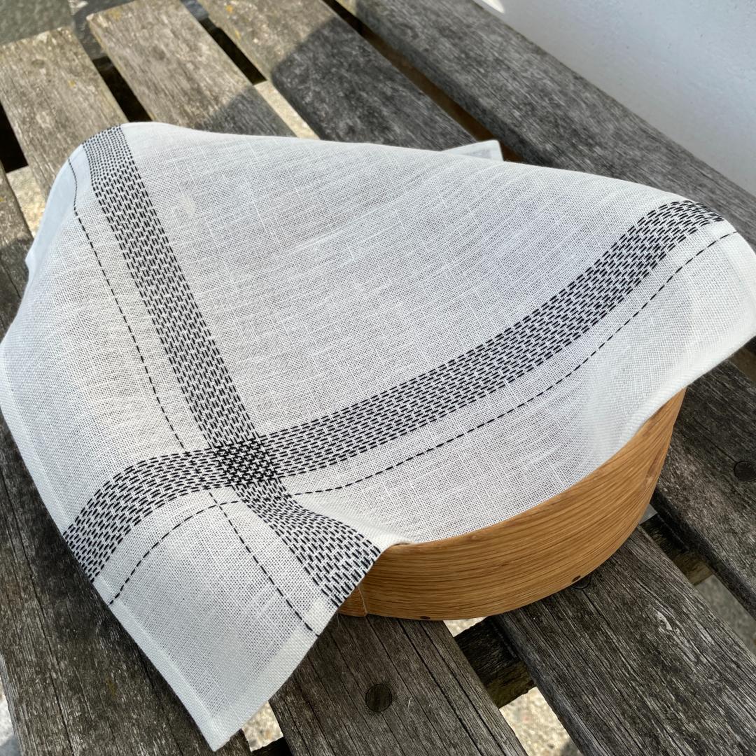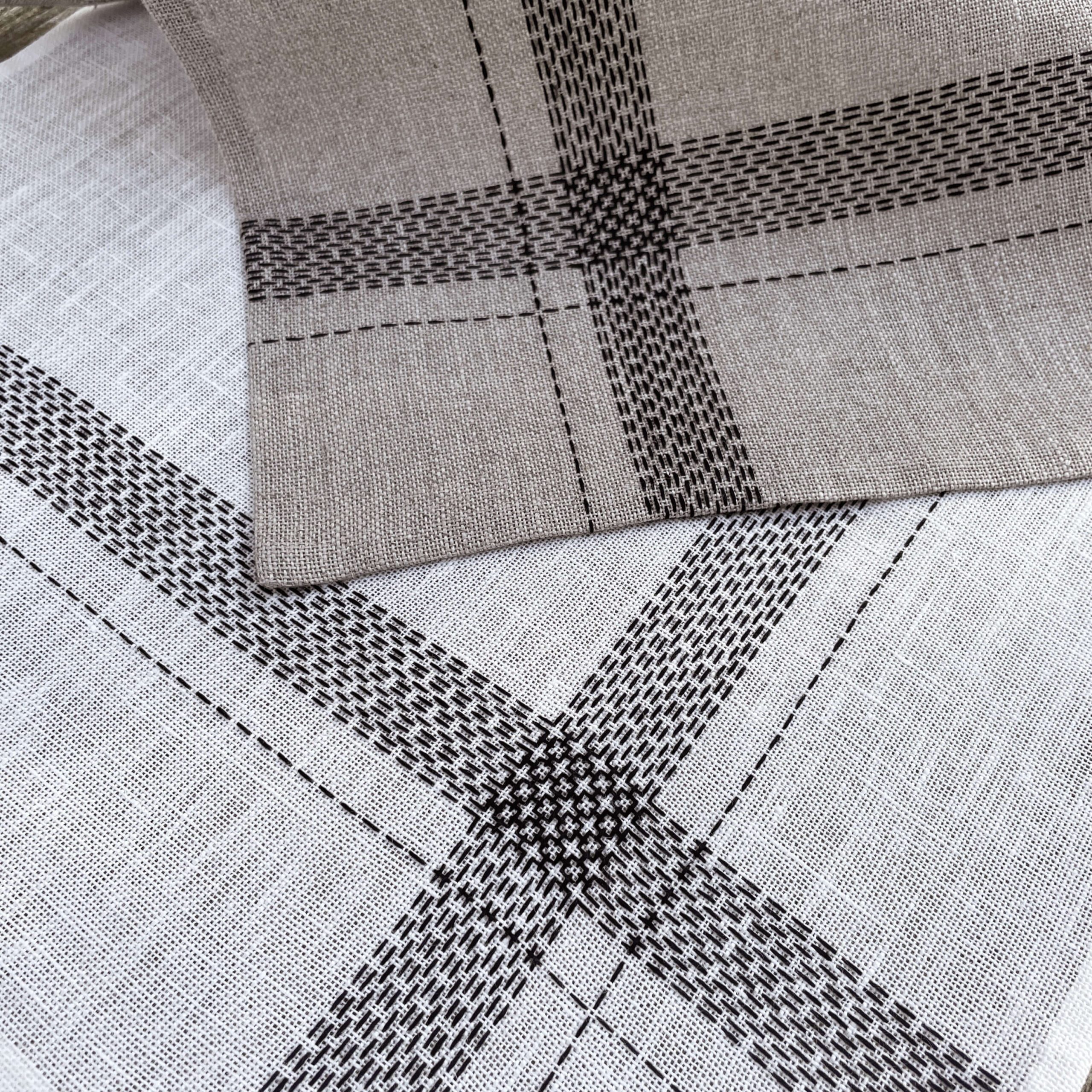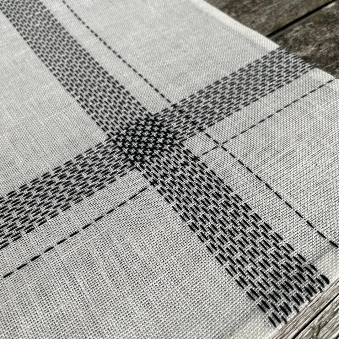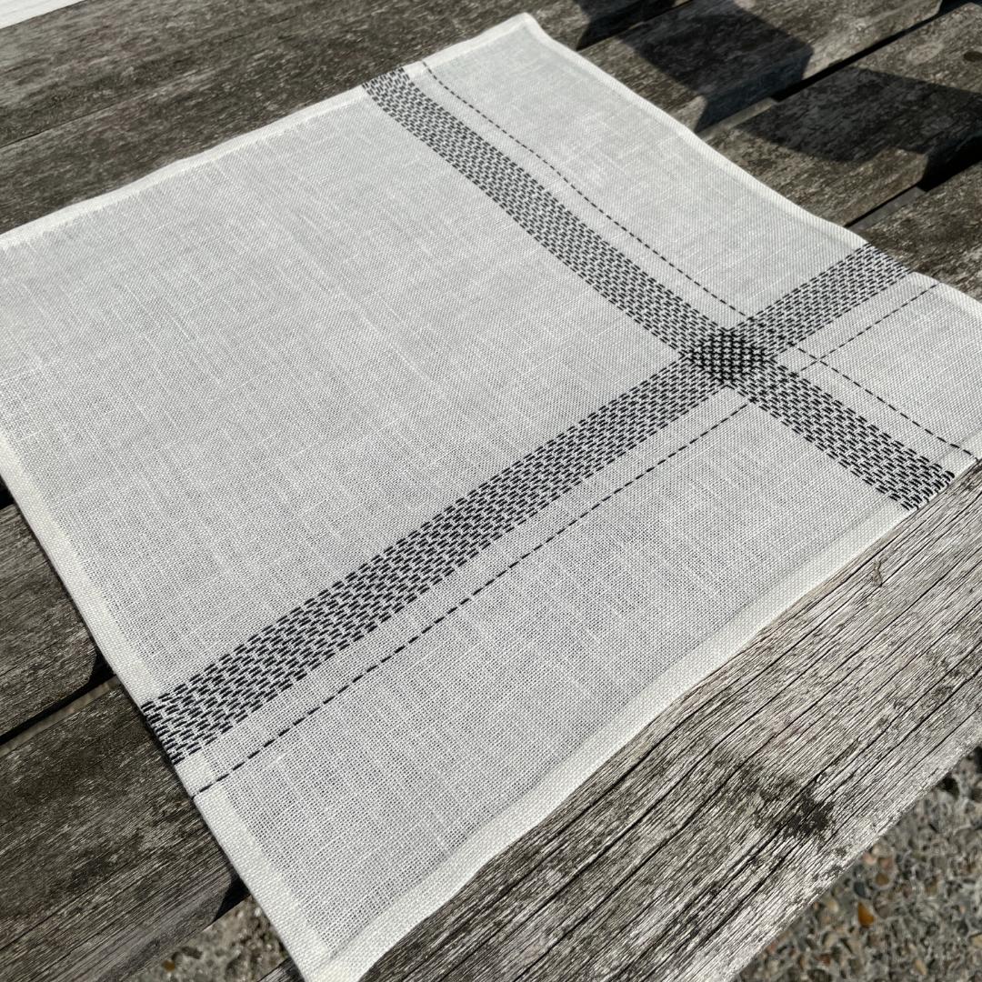 Du kan vælge mellem den blegede eller ublegede version. Serviettens dekoration er lavet med forsting i et nøje udvalgt blackwork mønster. To borter løber fra side til side, og hvor de mødes opstår et elegant grafisk mønster. Den gamle teknik får et nyt og enkelt udtryk på en moderne og brugbar serviet.
