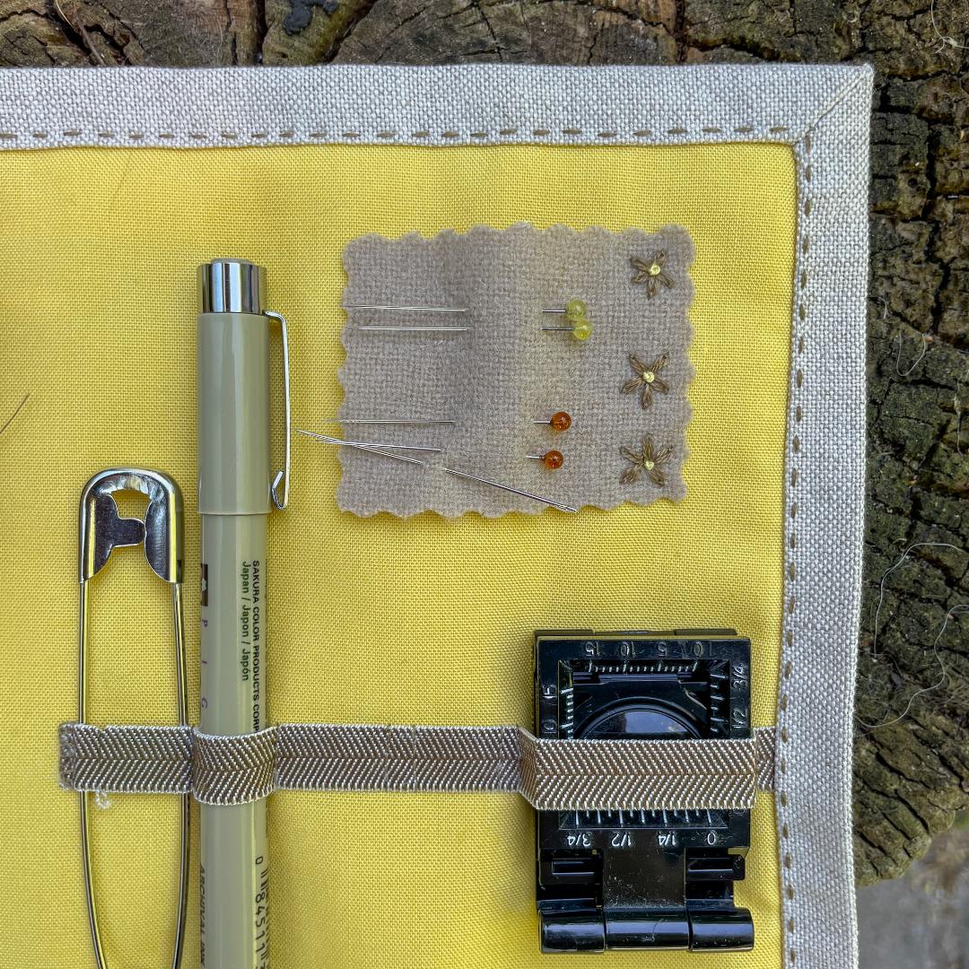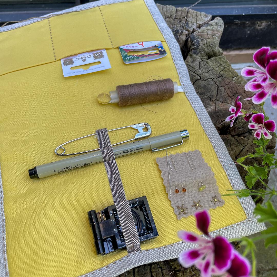 Du kan også vælge at investere i en materialepakke med alle de materialer du skal bruge samt en et udførligt hæfte med sy- og monteringsvejledning til din personlige sypung, der er ideel til at opbevare de nåle, sakse og andet udstyr, du skal bruge til din broderiprojekt. I materialepakken er der stof med påtegning, masser af garn, foerstof og andre monteringsmaterialer som bl.a. elastikker, uld til nåleholder og silke-beklædt knap.