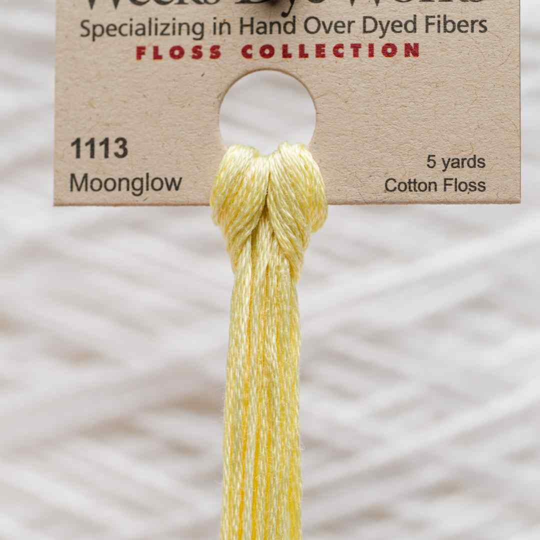 Weeks Dye Works – 1113, også kaldet Moonglow, er en blid gulgrøn nuance med dæmpede grålige undertoner. Farven minder om månens skær over et sommerlandskab, hvor lys og skygge mødes i et subtilt spil. Moonglow broderigarn tilfører en afdæmpet og drømmende karakter til dit broderi, ideelt til botaniske mønstre, ornamenter eller detaljer, hvor et diskret farvespil ønskes. Med Moonglow broderigarn bringer du en stemning af ro, poesi og naturlig elegance ind i dit projekt.