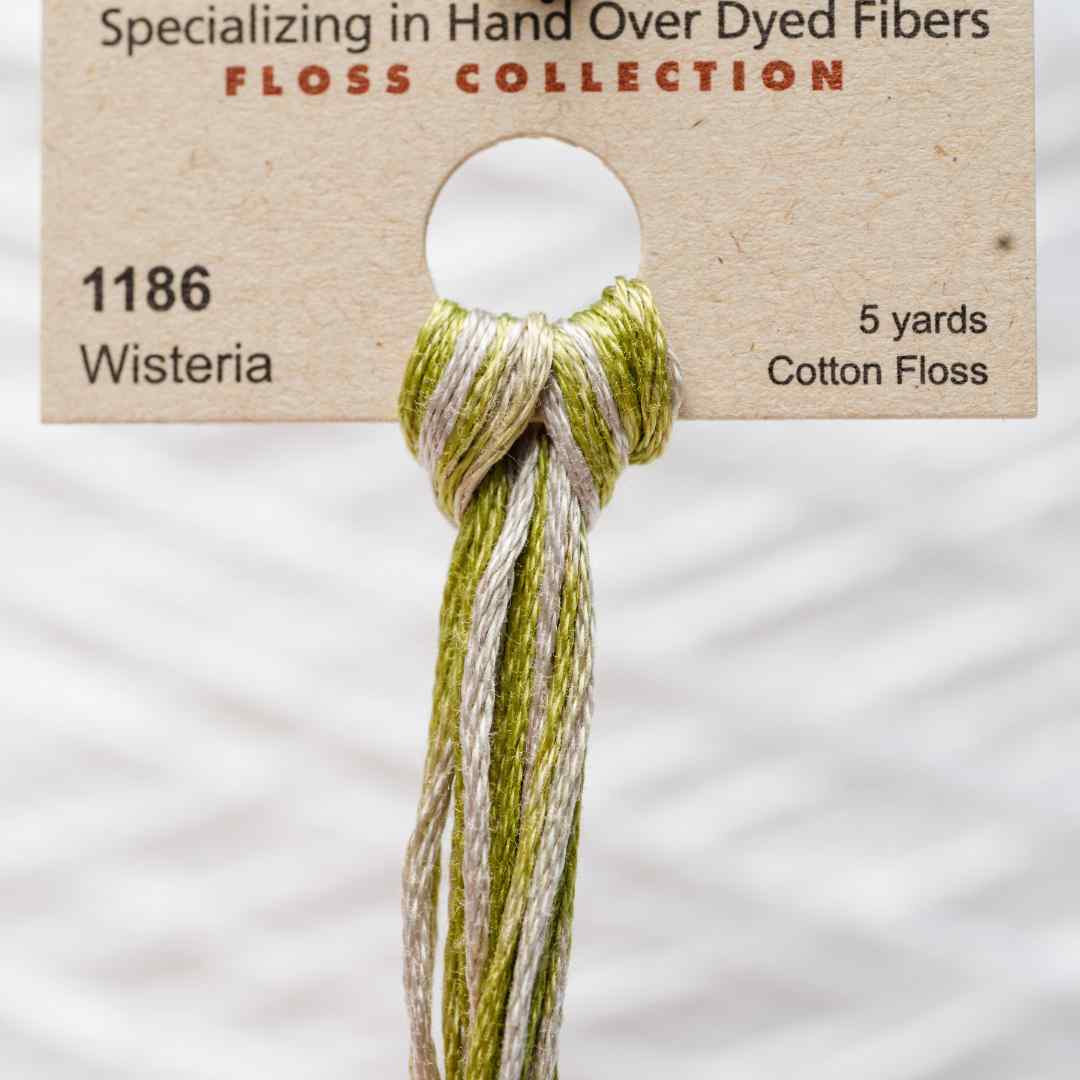 Weeks Dye Works – 1186, også kaldet Wisteria, er en sart blanding af grønlige og gråviolette toner, der giver et blødt og harmonisk farvespil. Farven minder om de hængende klaser af blåregn, hvor lyset spiller i bladene og skaber en let og poetisk stemning. Wisteria broderigarn tilfører elegance og ro til dit broderi, ideelt til blomster, romantiske motiver og delikate detaljer. Med Wisteria broderigarn bringer du en følelse af subtil skønhed og drømmende nuancer ind i dit projekt.