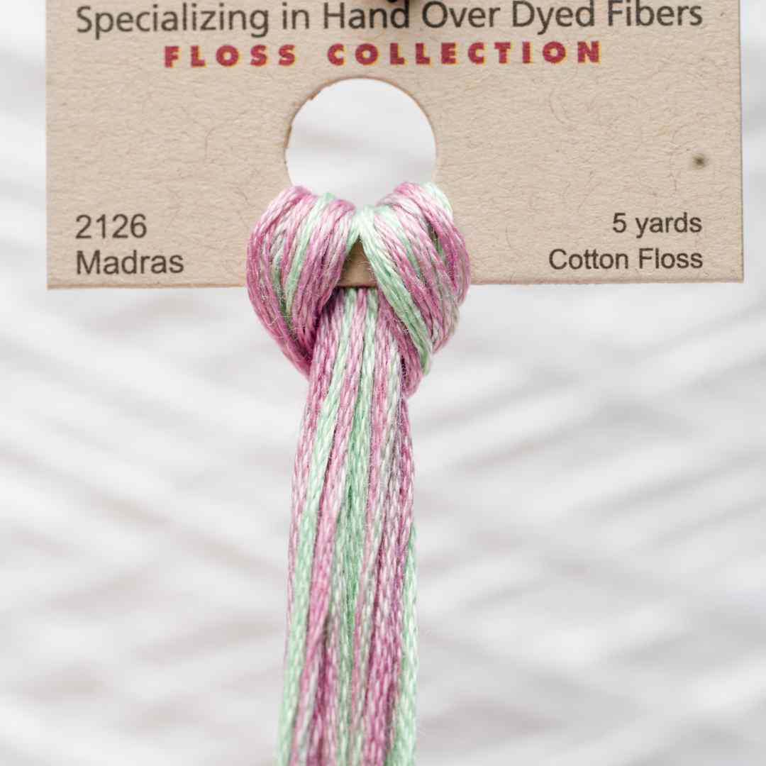 Weeks Dye Works – 2126, også kaldet Madras, er en blid farvekombination af lyserøde og lysegrønne toner, der skaber et frisk og harmonisk udtryk. Madras broderigarn tilfører dit projekt en let og livlig stemning, oplagt til blomster, forårsdetaljer eller feminine mønstre. Med Madras broderigarn giver du dit broderi en blød kontrast og en følelse af fornyelse.