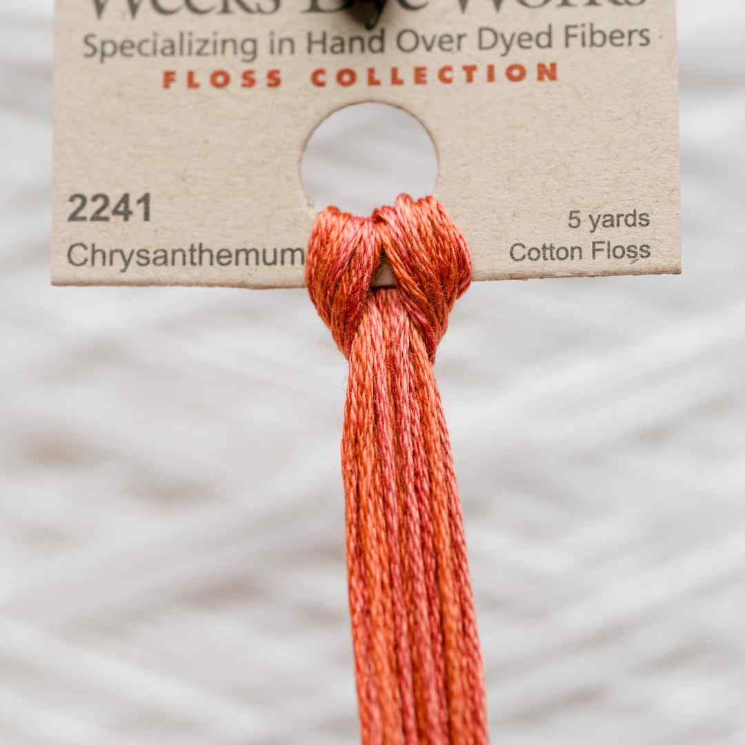 Weeks Dye Works – 2241, også kaldet Chrysanthemum, er en varm orange nuance med spil fra dyb kobberrød til lysere koraltoner. Chrysanthemum broderigarn tilfører projekter et levende præg, der minder om efterårsblade og blomster i fuldt flor. Med Chrysanthemum broderigarn giver du dit broderi en varm glød og en stemning af naturens skiftende årstider.