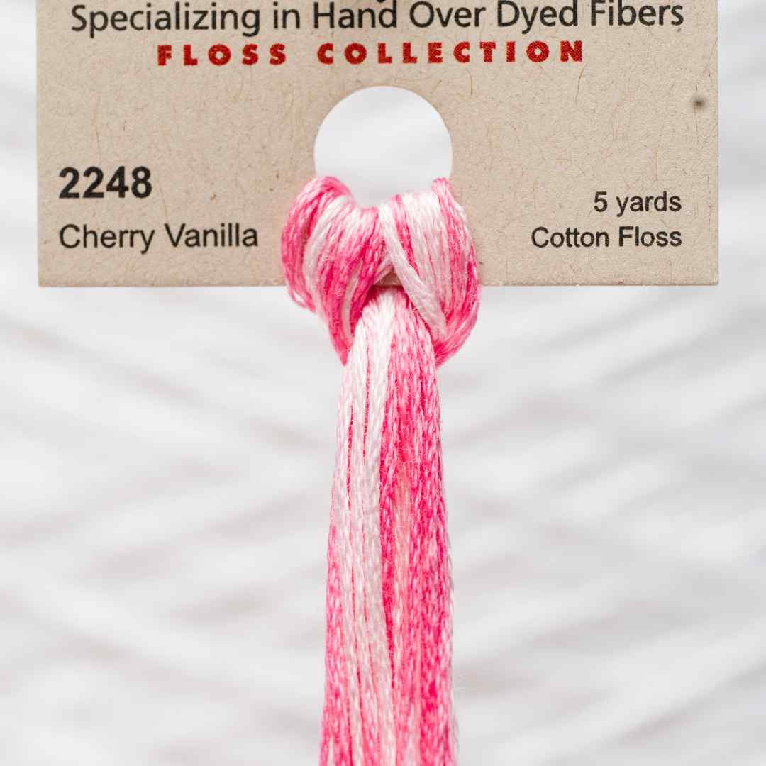 Weeks Dye Works – 2248, også kaldet Cherry Vanilla, er en livlig blanding af lyserøde og hvide toner. Farven giver et friskt og legende udtryk med bløde overgange mellem de lyse og mørkere nuancer. Cherry Vanilla er oplagt til blomster, romantiske detaljer og sommerlige projekter, hvor garnets farvespil kan skabe liv og variation i broderiet.