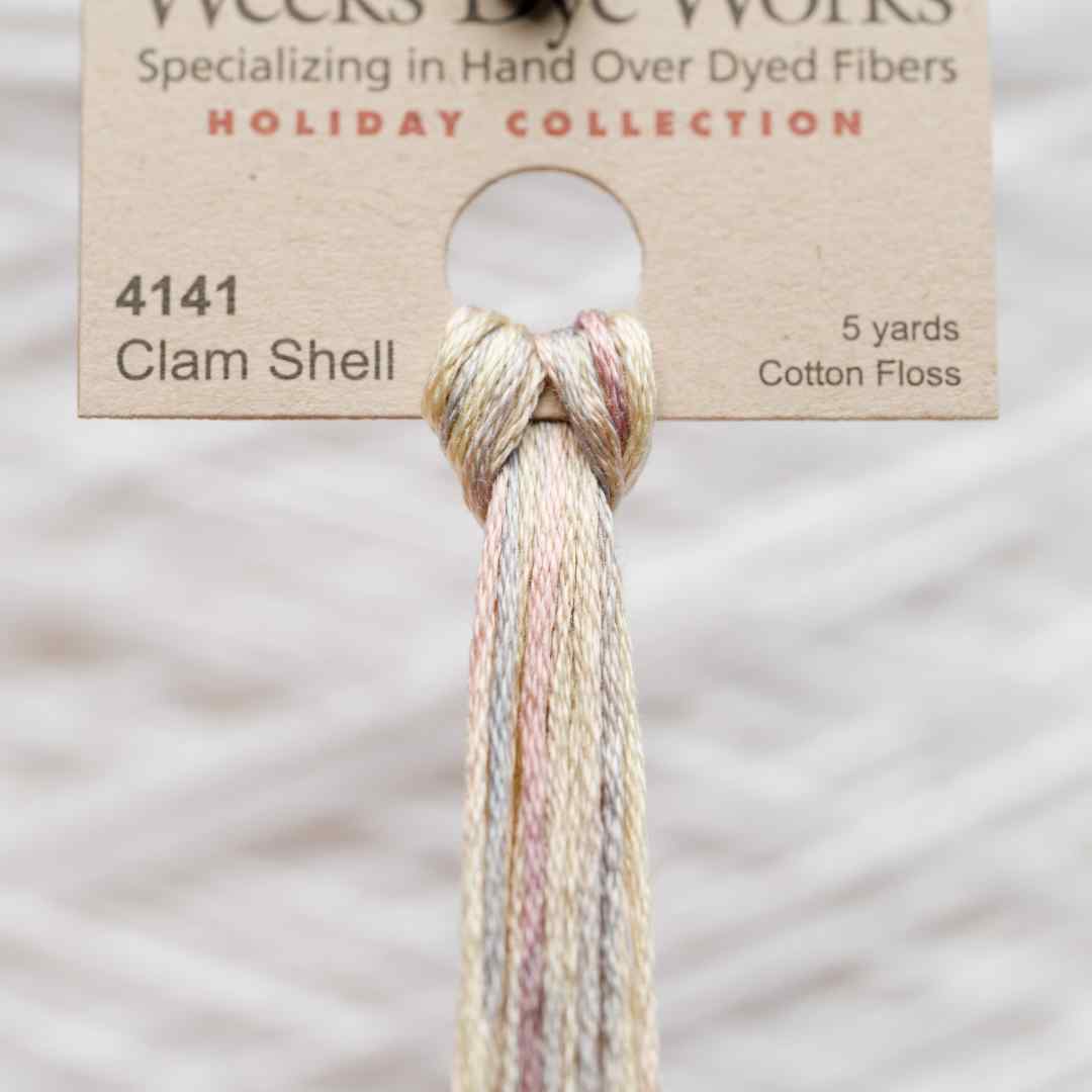 Weeks Dye Works – 4141, også kaldet Clam Shell, er en lys og afdæmpet kombination af beige, grå og svage rosa toner, der minder om perlemor og strandskaller. Clam Shell broderigarn tilfører dit projekt en blid og naturlig elegance, oplagt til strandmotiver, vintagebroderier og detaljer med et sart udtryk. Med Clam Shell broderigarn giver du dit broderi et diskret spil og en følelse af ro.